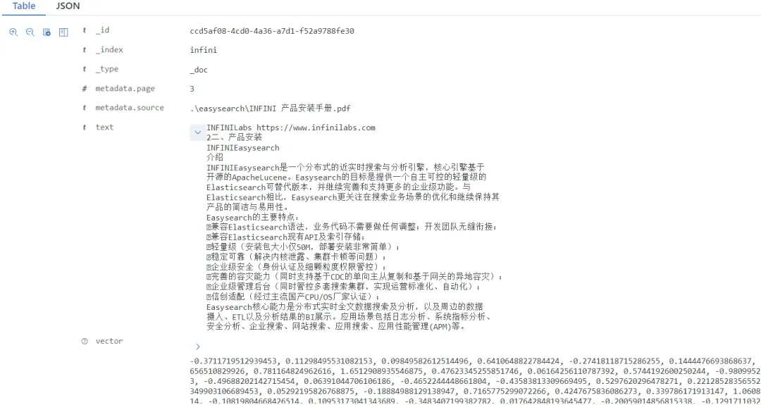通过上面的步骤,我们成功将文本块转换成了向量,并存入到了 easysearch 集群的 infini 索引中。