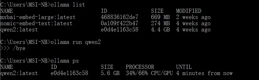 这里我们使用 ollama 在本地部署一个 qwen2 大模型,负责问题改写和生成答案。